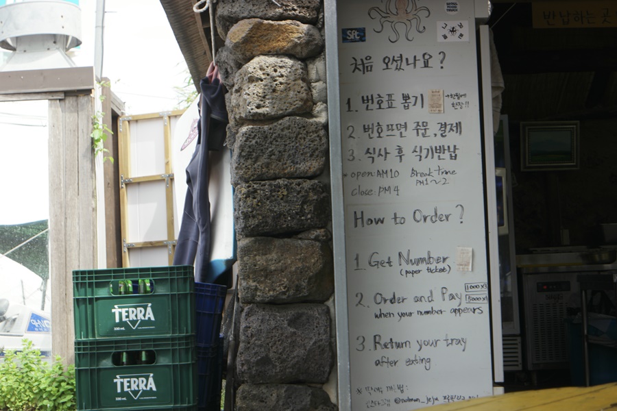이젠 번호표도 뽑아야 하고 메뉴는 문어라면은 찾아볼 수 없고 해물라면만 있더군요. 냉장고 옆에 여러 가지 안내와 가재를 어떻게 까야하는지 볼 수 있는 인스타그램 계정이 있었습니다.