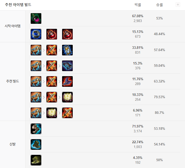 오피지지의 템트리는 보시면 가장 많이 선택한 것은 존야의 모래시계입니다. 제일 무난하단 뜻이겠죠. 그리고 밑으로 갈수록 픽률은 줄어들고 승률은 상승하는 것을 볼수 있습니다. 그 말뜻은 잘컸을 경우에 저렇게 간다는 뜻으로 해석되구요.