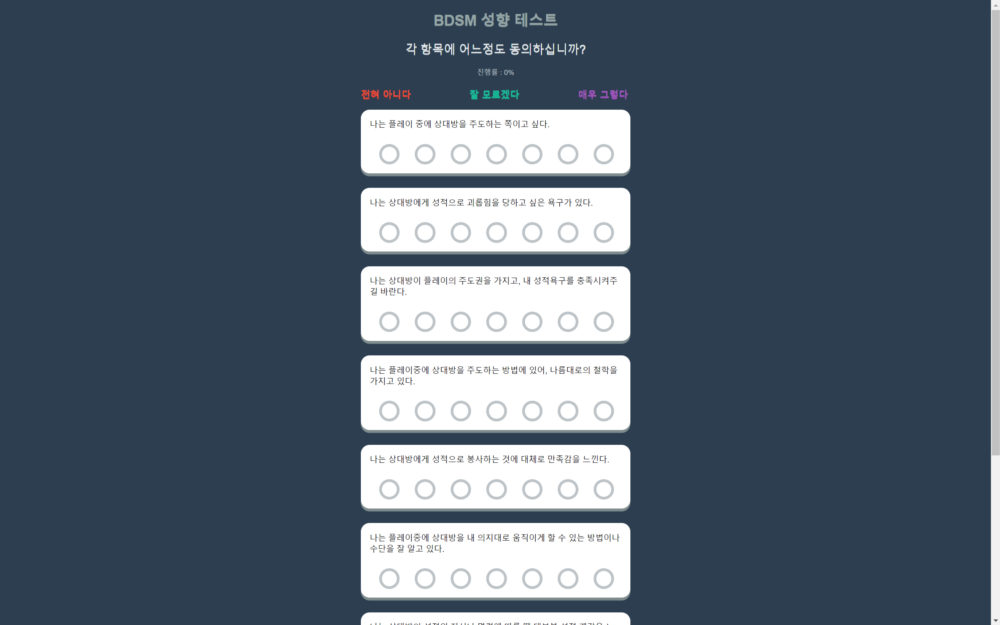 최근에 저의 성향에 대한 여러 가지 생각이 들면서 BDSM 성향 테스트라는 것을 해보았습니다. 인터넷의 테스트라는 것들이 다들 그렇지만 그렇게 정확하진 않습니다. 하지만 자기 자신을 알아가는 하나의 방법 정도로 생각하면서 테스트를 해보았습니다.