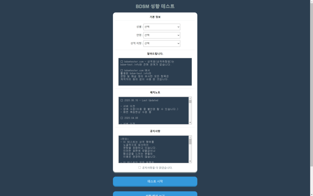 가장 먼저 보이는 화면입니다. 기본 정보를 입력하고 공지사항을 읽었다는 동의를 한 후에 테스트를 바로 시작할 수 있습니다. 세 개의 버튼이 밑에 있는데 테스트 시작, 성향 해설, 성향표 작성입니다. 저는 이렇게 많은 성향이 존재하는지 오늘에야 알게 되었습니다. 그냥 막연하게 나는 b, d, s, m 중에 하나겠구나 생각했는데 생각보다 세세하게 나와서 놀랐고 테스트 결과가 생각했던 것과 조금 다르다는 점에서 놀랐습니다. 오히려 좀 더 내 성향을 정확히 알게 된 것 같습니다.
